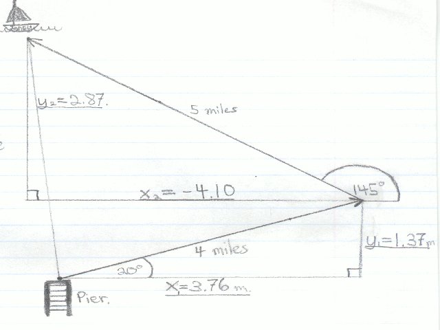 sailboat sails 4 miles from the pier at 20 degrees north of east. Then,