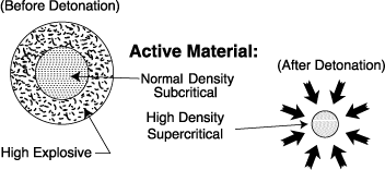 surrounding a subcritical sphere of fissionable material. When the high explosive is