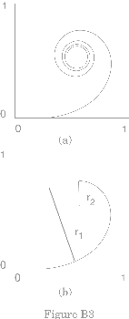 The shape normally used is part of a spiral called a clothoid. A clothoid spiral is useful for joining trajectories and is sometimes used in highway and railroad interchanges. The radius of curvature of a clothoid varies linearly with the arc length, starting at the origin, and the center of curvature is not a fixed point, but depends on where you are on the curve (Fig. B3b). Thus when entering the loop at a given speed v your centripetal acceleration v2/r need not be too large. However, when you have reached the top of the loop, with a lower speed v,the radius of curvature has decreased so that v2/r will be large enough so that the net force will hold you in your seat.