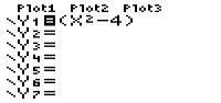 Another way to solve an equation while still using factors is to graph it. Take the simple equation used earlier y=(x^2-4). Put this equation into the y= part in your calculator. (Figure One). Then you will graph the equation. (Figure Two) Looking at the window (Figure Three), the x-intercepts, which are the factors in the equation or where y equals zero are 2 and -2 just as we found earlier (Figures Four and Five).