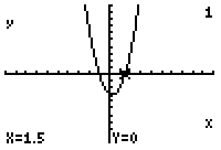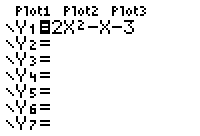 Once again we will use graphing to check the answers that we found. Take the simple equation used earlier y=(2x2-x-3). Put this equation into the y= part in your calculator. (Figure One). Then you will graph the equation. (Figure Two) Looking at the window (Figure Three), the x-intercepts, which are the factors in the equation or where y equals zero are -1 and 3/2 just as we found earlier (Figures Four and Five).