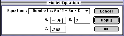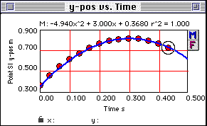If you entered A:=4.94, B:=3.00, and C:=0.368, your model should look something like this: ![]() A Graph Window shows data points and the line that is a graphical representation of mathematical model of the data. The constant A (for the x2 term) should be approximately -4.9 since this is a projectile, which can be modelled by the equation y = 1/2 gt2 + vot + yo ![]() |